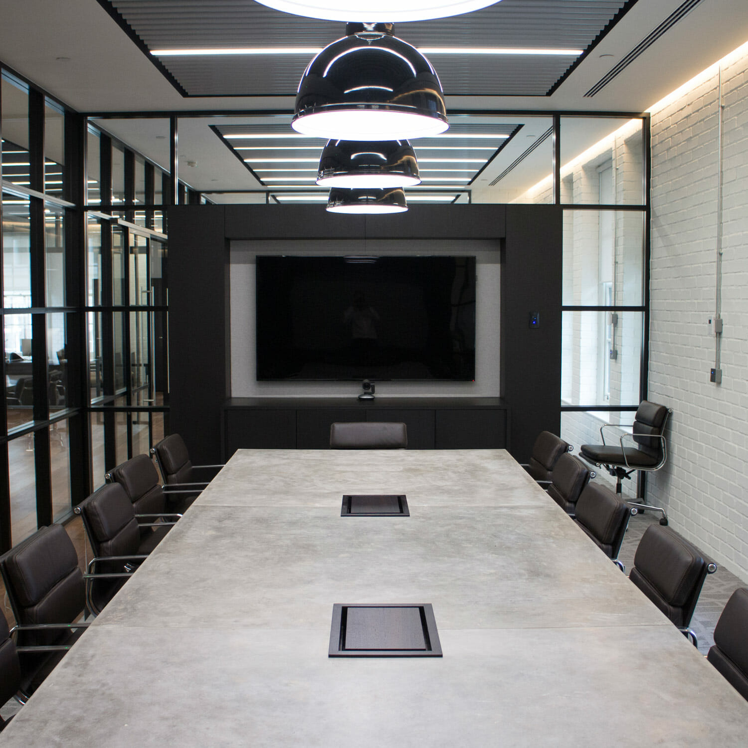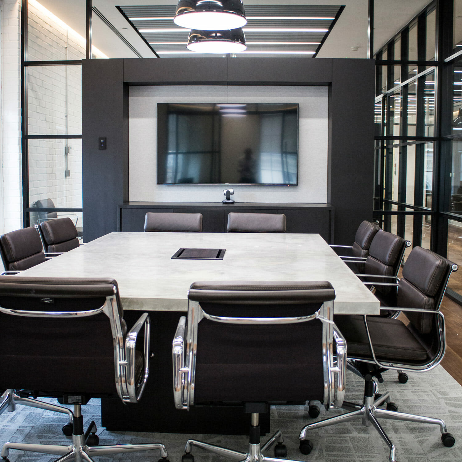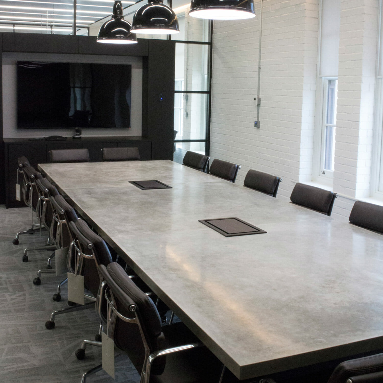 Our team of specialist artisans (based in Yorkshire) use various techniques and if the design requires some similar to that of sculptors to custom form your conference table. Then to finish the concrete conference tables we polish and fit it with modern technology, incorporating easy access points to allow cable management for telecommunications equipment and data points. We can also provide complimentary associated furniture such as Credenzas, Concrete Coffee Tables mixed with wood or executive Concrete desking.