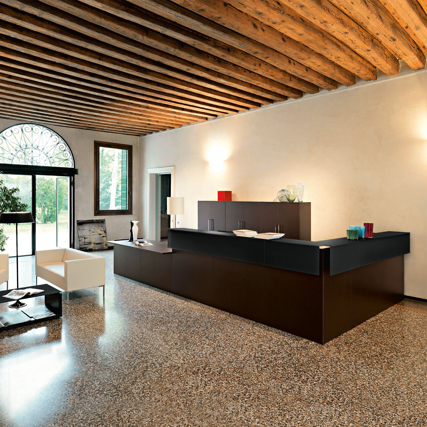 Customizable Design: Factory Reception offers a range of customization options to perfectly align with your company’s aesthetic. It features a wengé ebony or walnut structure, with wood melamine or lacquered tops finished with toughened glass or marglas. These customizable elements allow you to create a reception counter that reflects your unique corporate culture and identity.