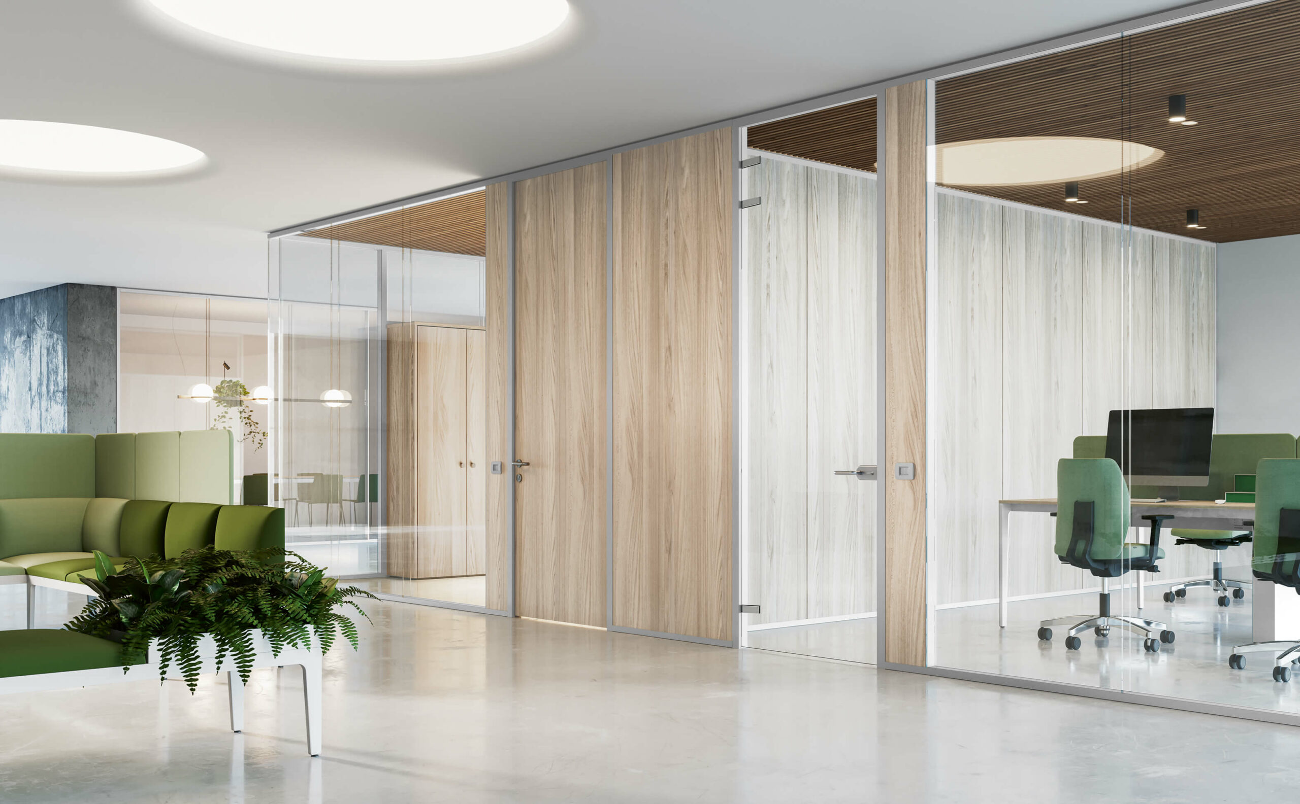 For a sleek and minimalist design, the K82 Partition Wall also offers sliding door options in both framed and polished flush versions. These sliding doors are inserted in the upper profile of the wall, complete with soft-open and soft-close devices, ensuring smooth and silent operation. With options for single or double glazed doors featuring 10 mm thick glass and an aluminium perimeter profile, enjoy a clean and contemporary look that enhances your workspace aesthetics.