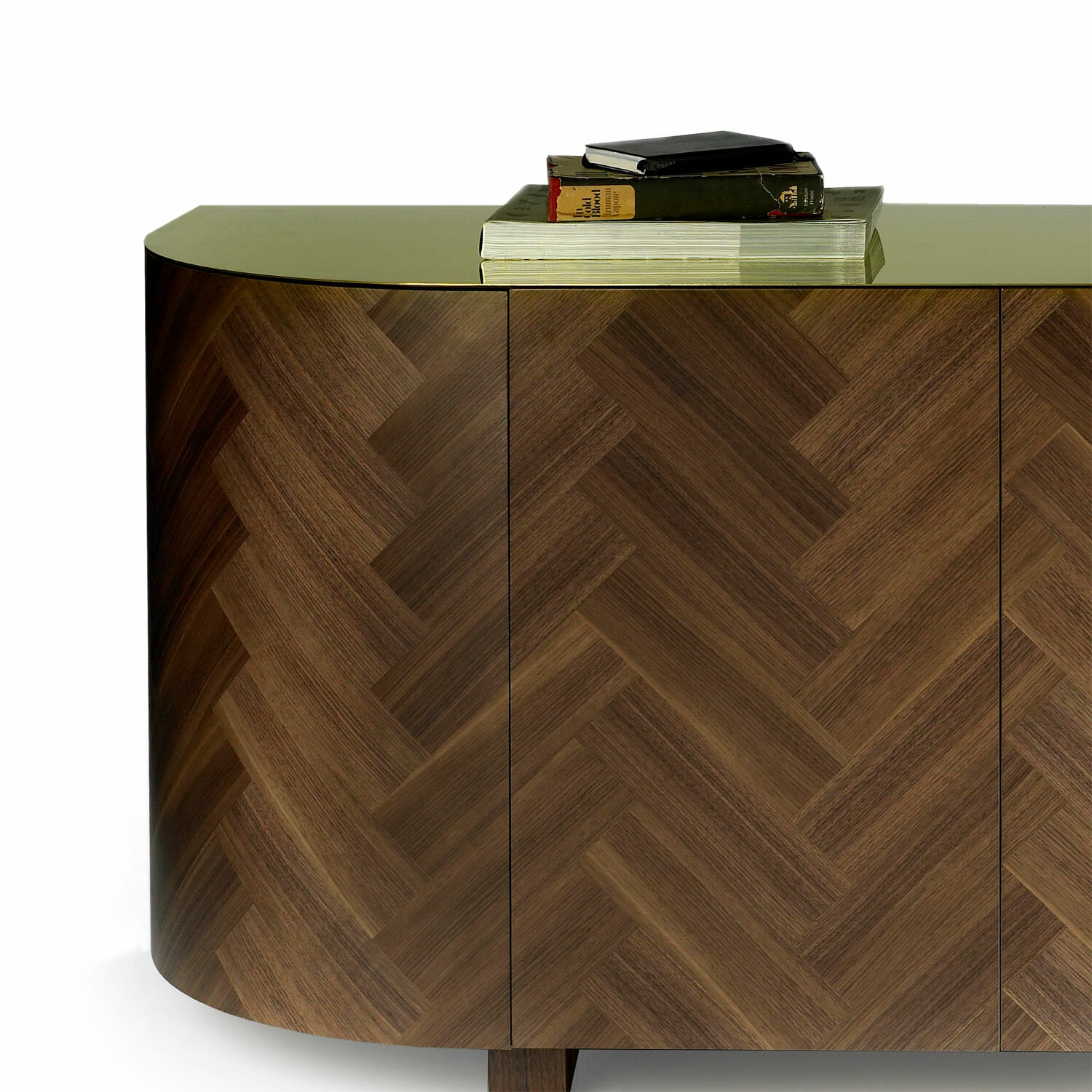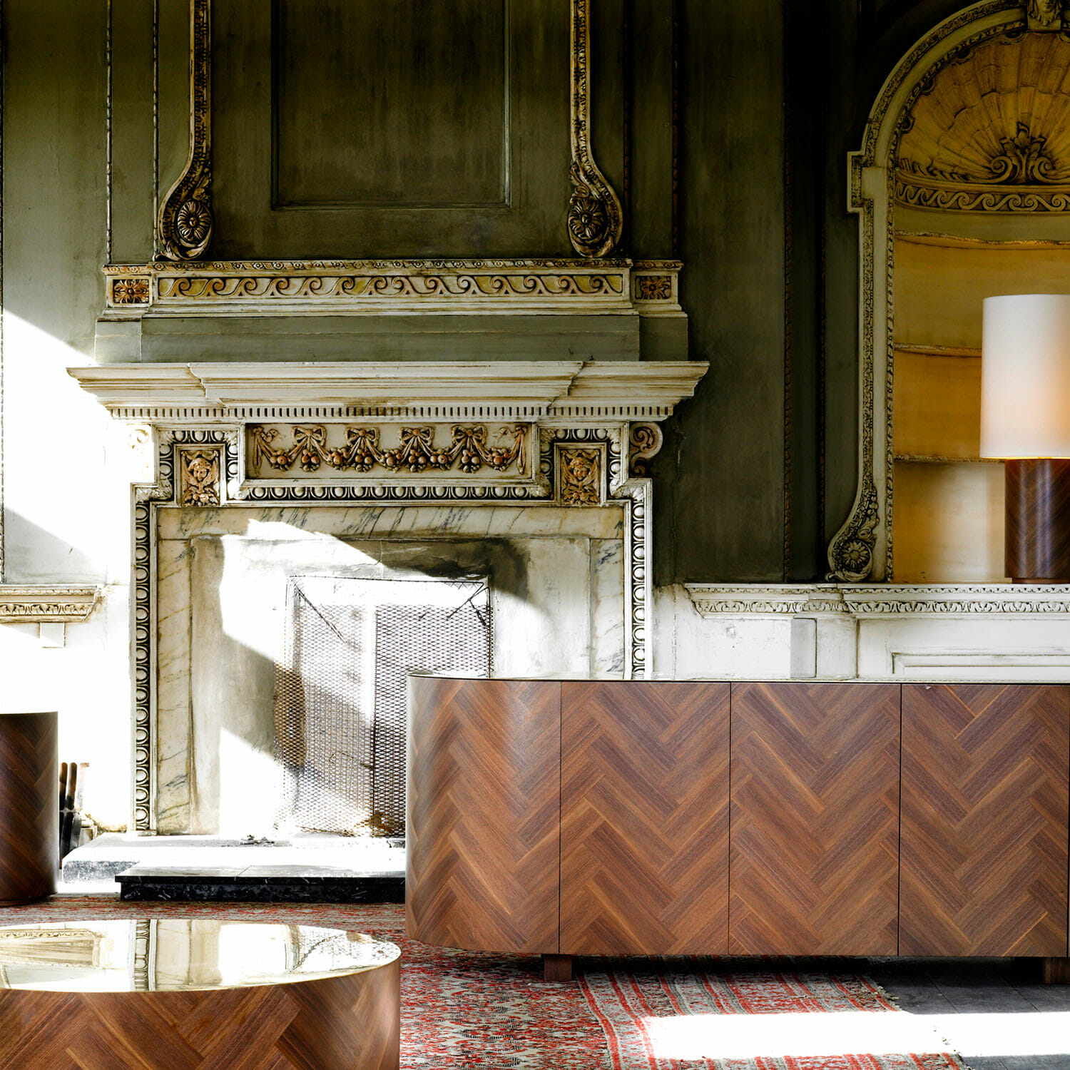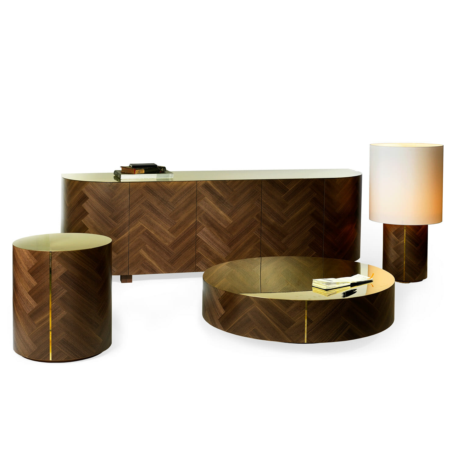 Introducing the Parq Life Collection by Lee Broom in collaboration with Deadgood. This unique four-piece collection combines the traditional herringbone pattern of parquetry flooring with contemporary curves in furniture, resulting in a stunning and modern design. Each piece in the Parq Life Collection is meticulously crafted using a sleek satin-finished walnut veneer, giving the appearance of solid wood. The complementing brass accents add a touch of elegance and sophistication to the collection. Experience the perfect blend of tradition and innovation with the Parq Life Collection. From the sideboard to the coffee table, lamp, and side table, each piece showcases the exquisite craftsmanship and attention to detail that Lee Broom and Deadgood are renowned for. Not only does the Parq Life Collection make a striking visual statement, but it also offers functionality and practicality. The sideboard provides ample storage space, while the coffee table serves as a stylish centerpiece for your living area. The lamp illuminates your space with a warm and inviting glow, and the side table offers a convenient surface for your everyday essentials. Transform your interior with the Parq Life Collection, a testament to the collaboration between Lee Broom and Deadgood.