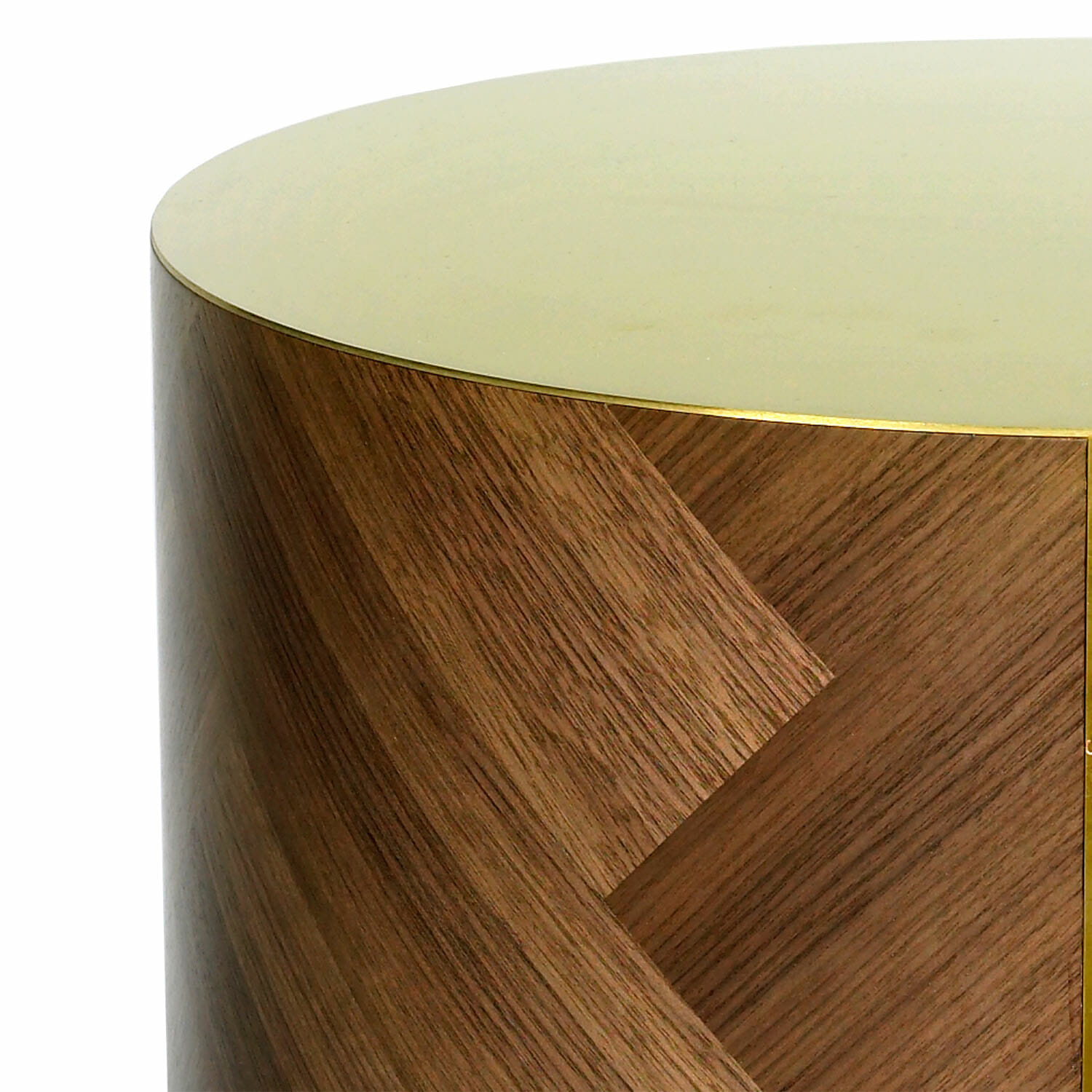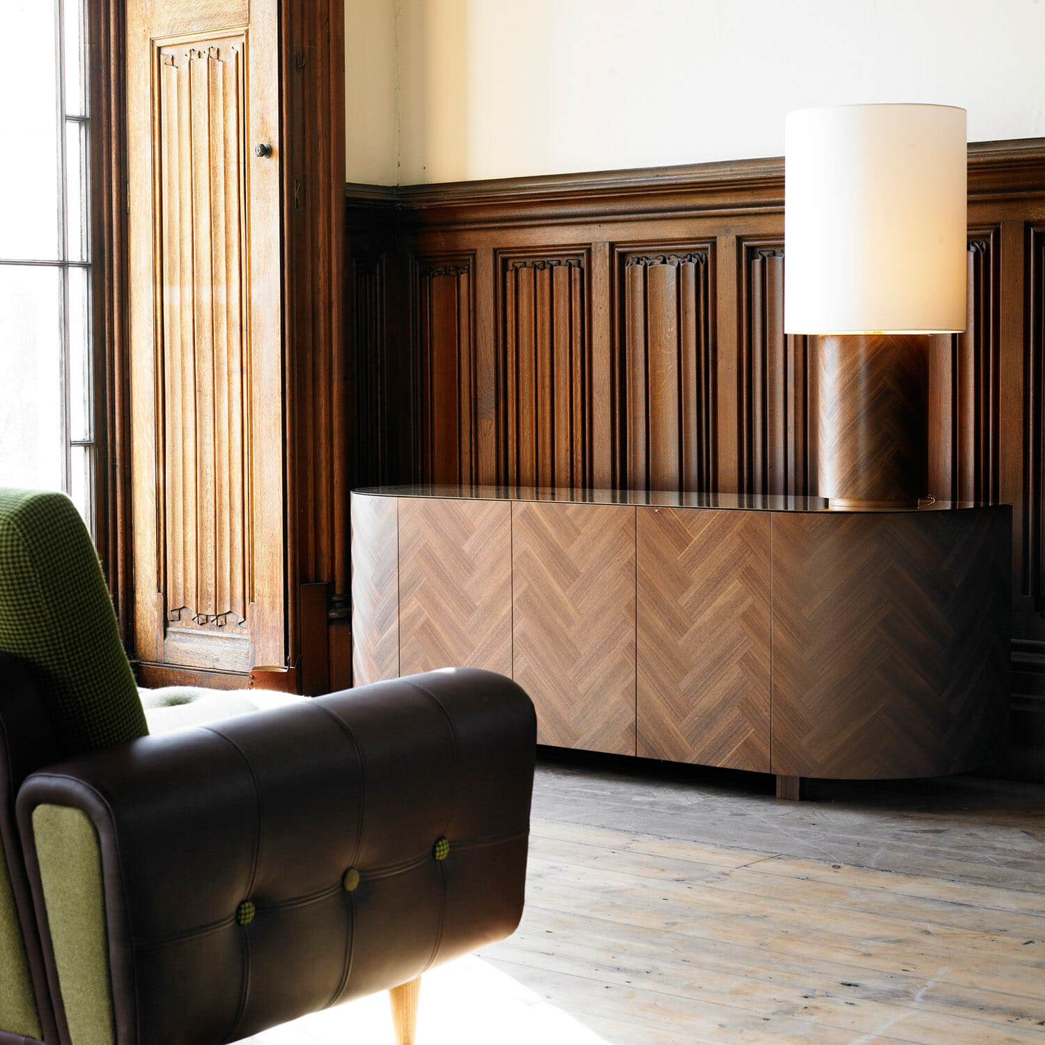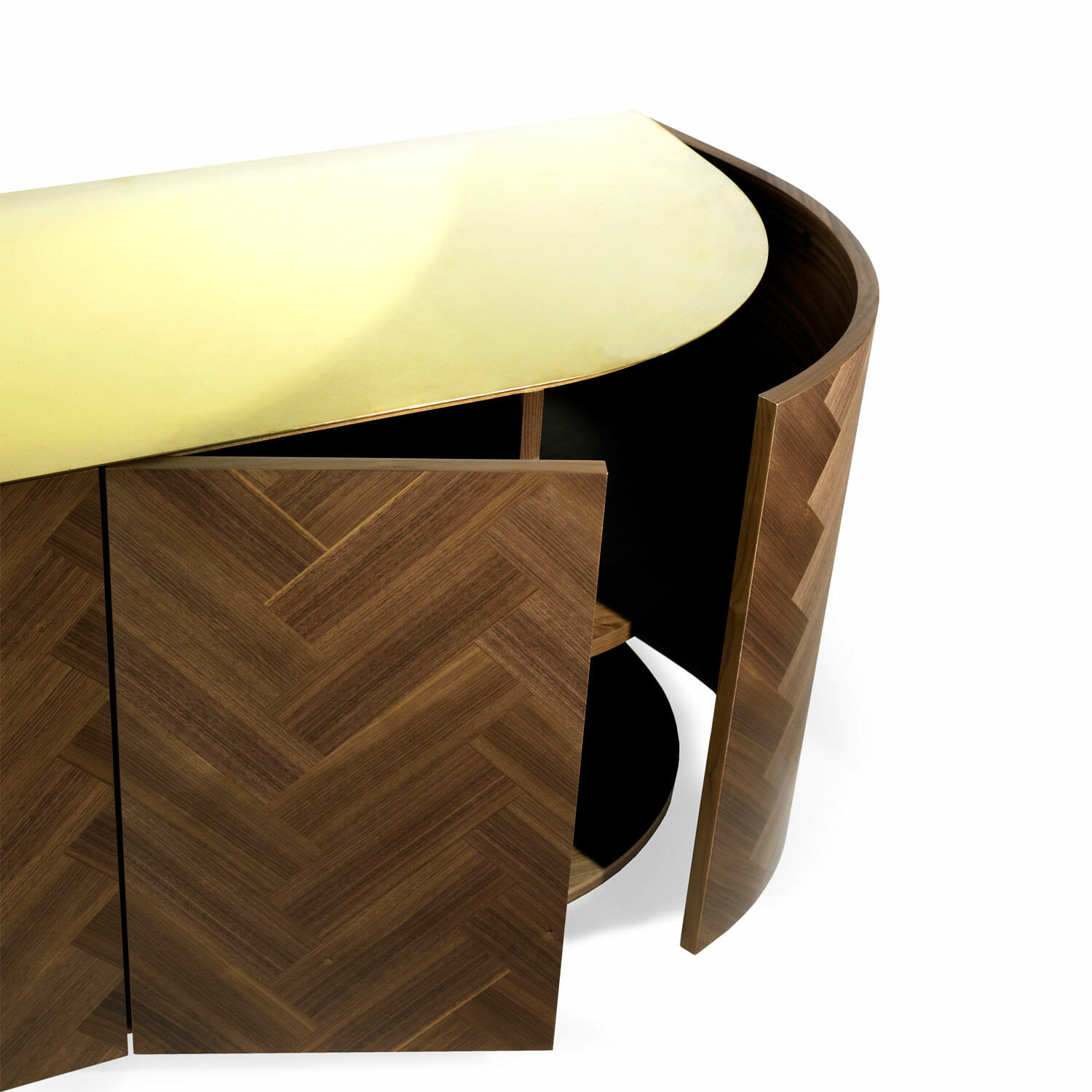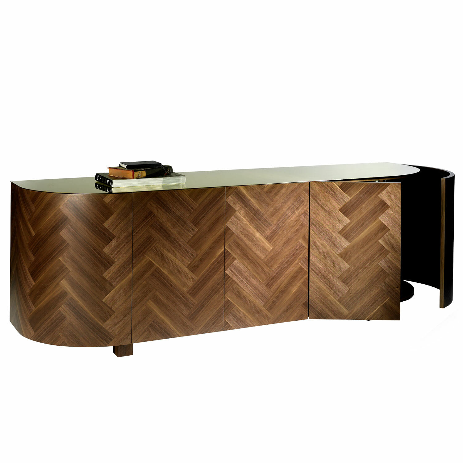 Introducing the Parq Life Collection by Lee Broom in collaboration with Deadgood. This unique four-piece collection combines the traditional herringbone pattern of parquetry flooring with contemporary curves in furniture, resulting in a stunning and modern design. Each piece in the Parq Life Collection is meticulously crafted using a sleek satin-finished walnut veneer, giving the appearance of solid wood. The complementing brass accents add a touch of elegance and sophistication to the collection. Experience the perfect blend of tradition and innovation with the Parq Life Collection. From the sideboard to the coffee table, lamp, and side table, each piece showcases the exquisite craftsmanship and attention to detail that Lee Broom and Deadgood are renowned for. Not only does the Parq Life Collection make a striking visual statement, but it also offers functionality and practicality. The sideboard provides ample storage space, while the coffee table serves as a stylish centerpiece for your living area. The lamp illuminates your space with a warm and inviting glow, and the side table offers a convenient surface for your everyday essentials. Transform your interior with the Parq Life Collection, a testament to the collaboration between Lee Broom and Deadgood.