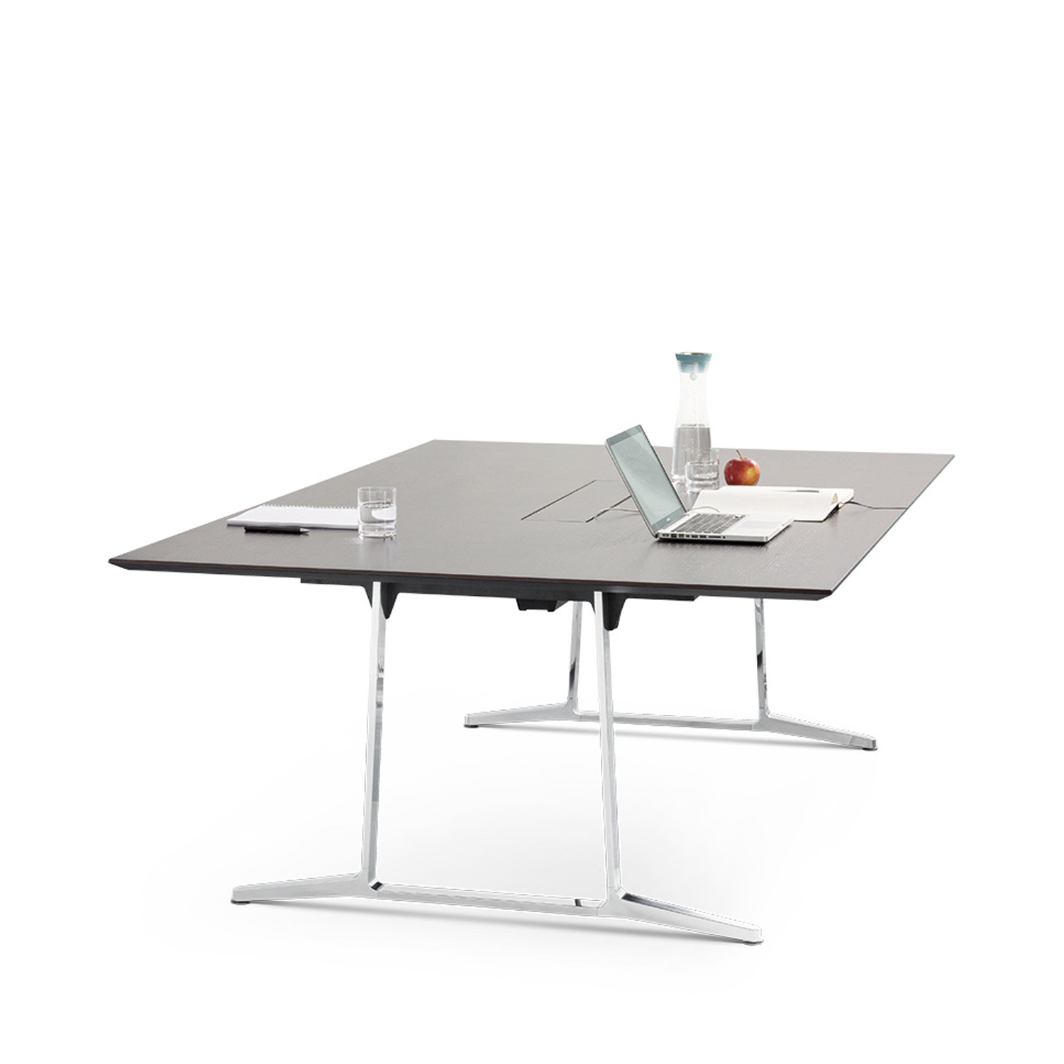 Additionally, the Skill contemporary meeting table boasts a sophisticated cable management system that ensures a clean and tidy workspace by allowing cables to be routed through invisible guides, with easy connections at the tabletop level for seamless media integration.
