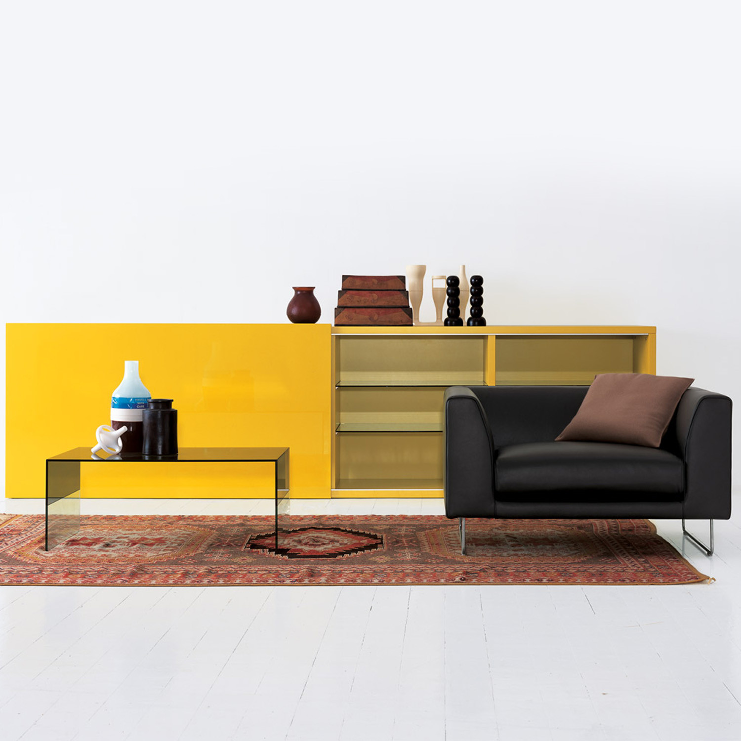 Introducing the Smoke Coffee Table by Cappellini – a masterpiece of design and craftsmanship that will captivate your senses. With its unique mitring of transparent and fume glass on both sides, and the continuation of smoked glass across the table top, the Smoke table is a true conversation starter.