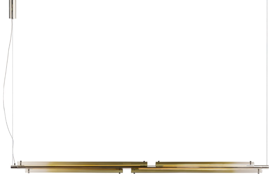 The Tratto hanging lamp fixture features hand-cut crystal elements that are available in four gradient shades. These cut crystals help to create a spectral glow, making the Tretto a perfect office lighting option.