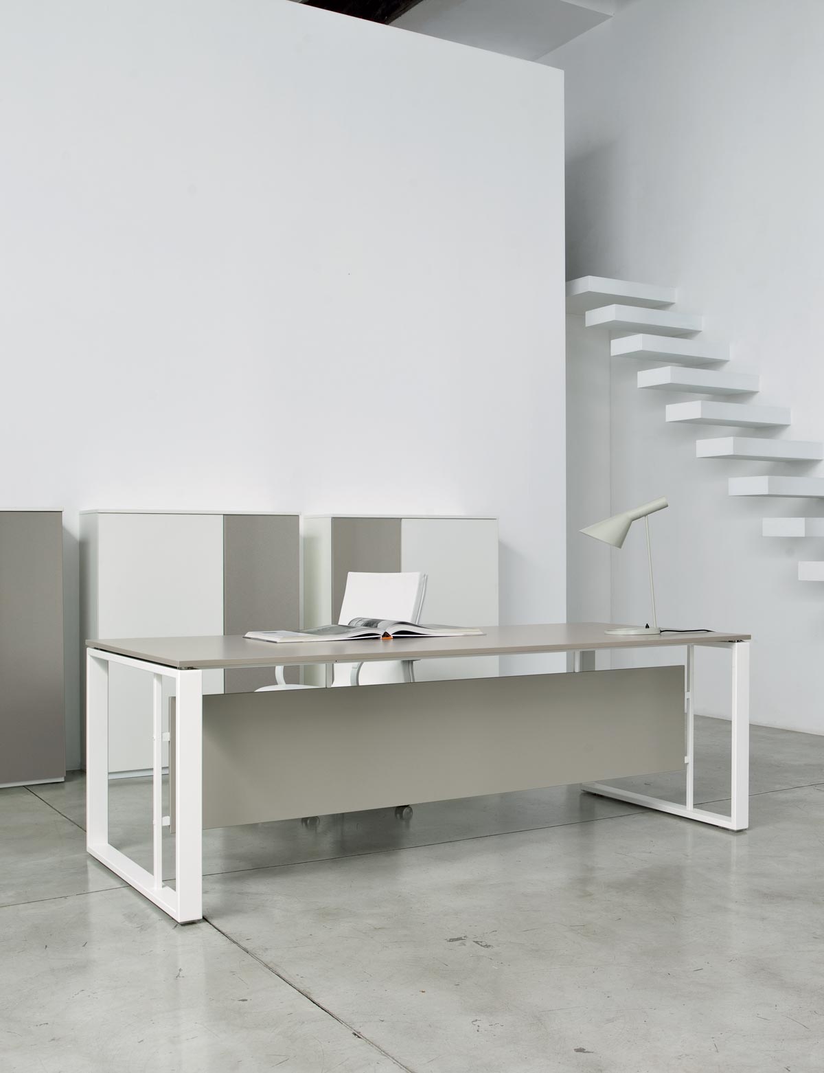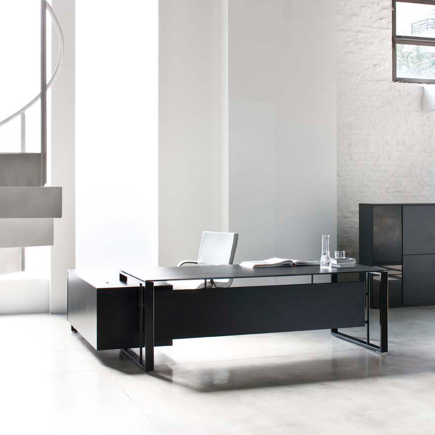 This contemporary executive desk seamlessly integrates modern technology, featuring discreet top accesses for power outlets, USB ports, and network connections. A cleverly concealed cable duct beneath the surface keeps the workspace clutter-free, making it a practical choice for contemporary executive desks.